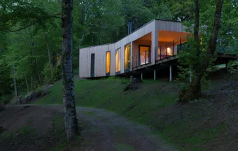 The 6 contemporary cabins of the domain are open to nature thanks to their large bay windows and are designed for a comfortable immersion in the forest. All our cabins are equipped with water, electricity, a bathroom with shower, heating, indoor and outdoor furniture, as well as complete bedding. Breakfast is included to start the day gently, facing the majestic trees of the domain. Cabins are located 1 hour from Limoges, 1.5 hours from Clermont-Ferrand, 2.5 hours from Bordeaux.