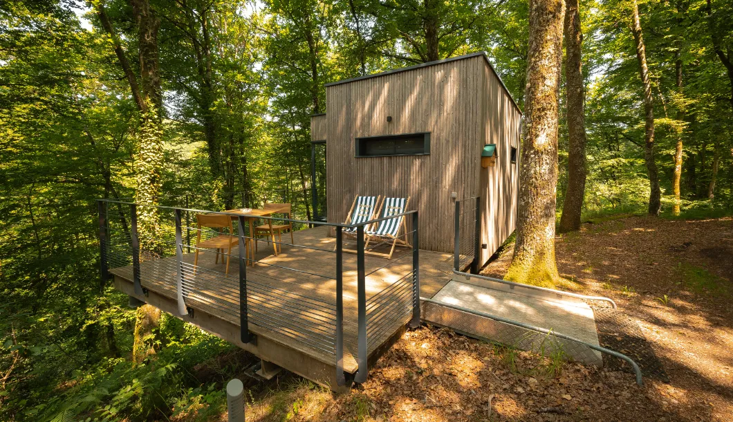Le domaine s’étend sur 40 hectares et propose des cabanes espacées les unes des autres, permettant de préserver le calme et l’intimité. Leur conception privilégie des matériaux naturels et des ouvertures sur l’extérieur.